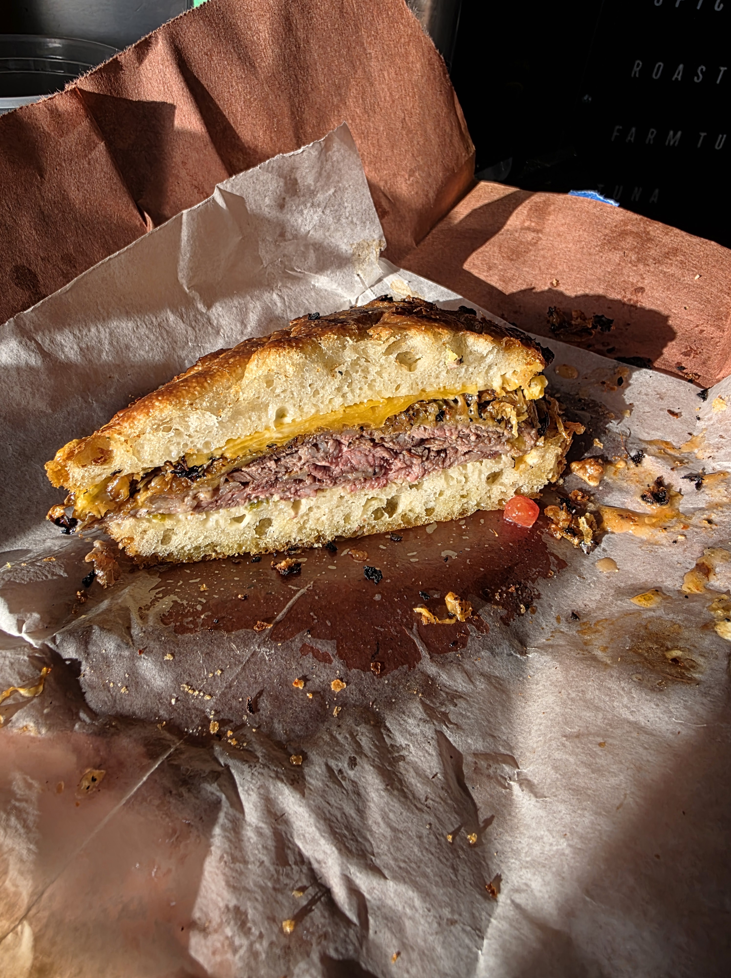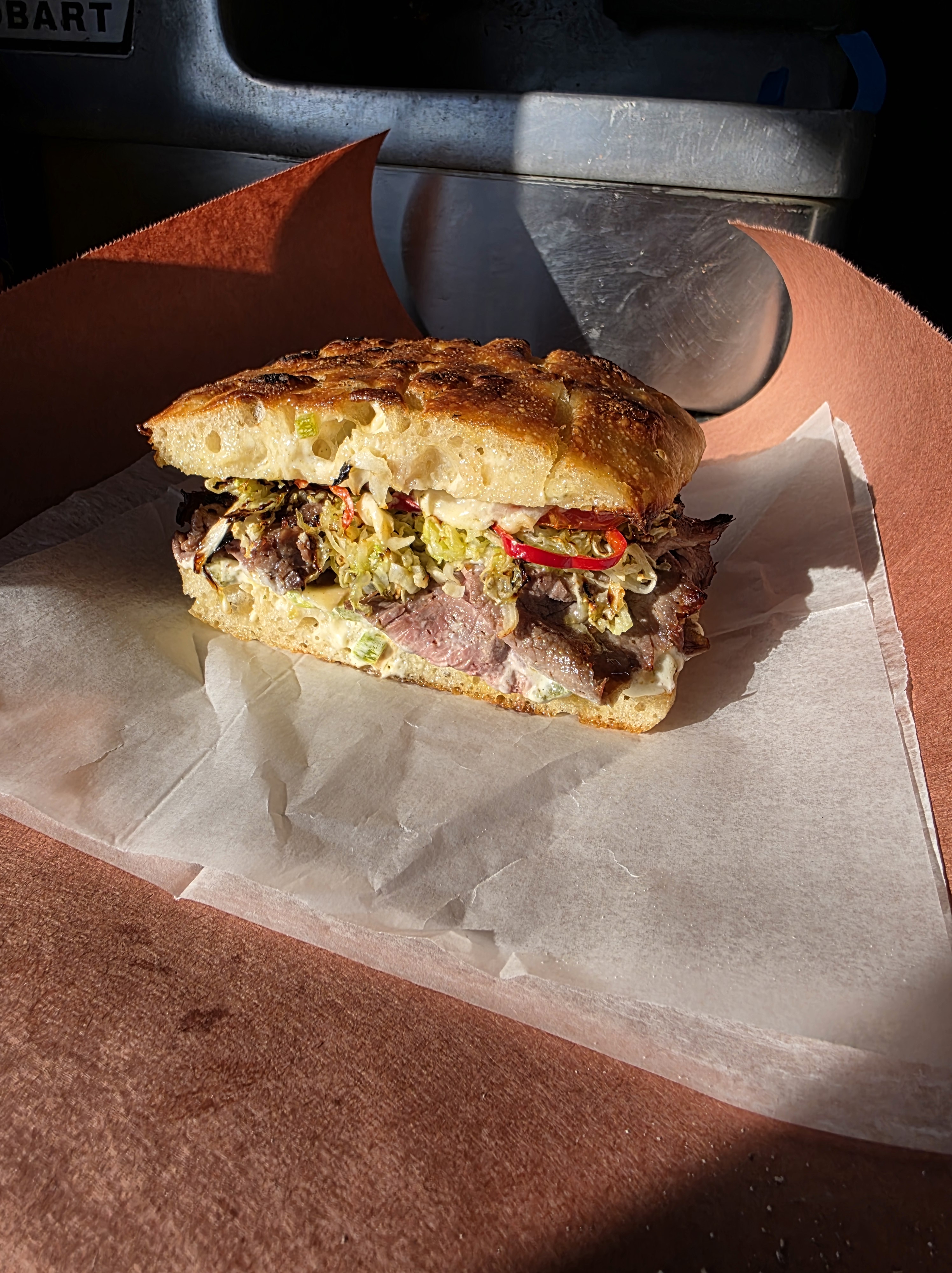 Fire Roasted Beef, Roasted Tomato, Jalapeno, Spicy Mayo, Sharp Cheddar, Fire Roasted Cabbage Slaw